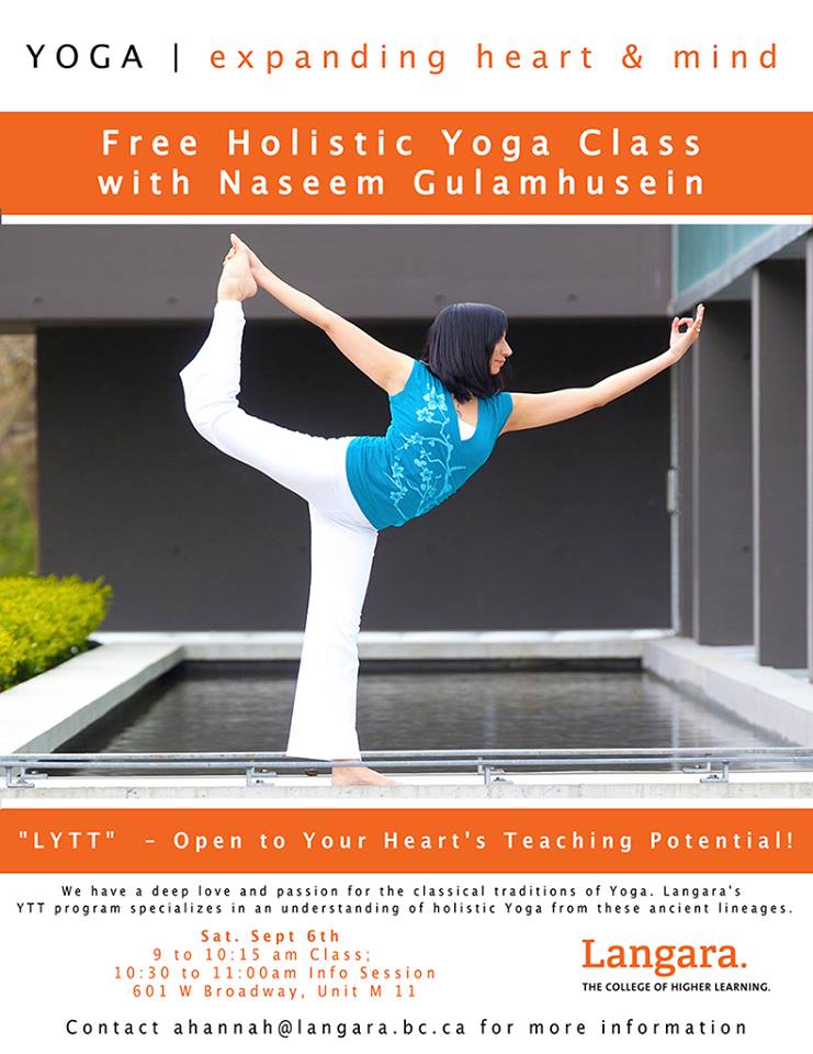Sept. 20/21st is the first LYTT (Langara Yoga Teacher Training) weekend! You can still get in and you will be so glad you did! Deepen your practice and learn to teach holistic, safe and balanced yoga classes. Build a solid foundation to teach yoga with confidence and ease. Graduates are in demand for their clarity and precision of instruction, as well as their technical skills, abilities and compassionate approach to teaching. For more info go to http://www.langara.bc.ca/continuing-studies/programs-and-courses/programs/yoga/index.html